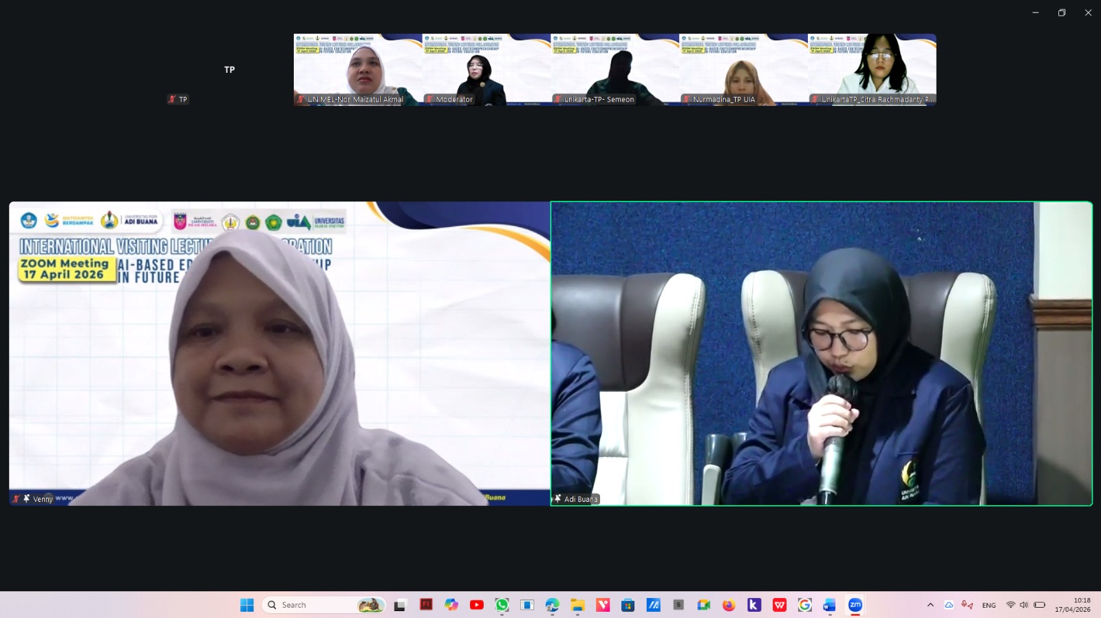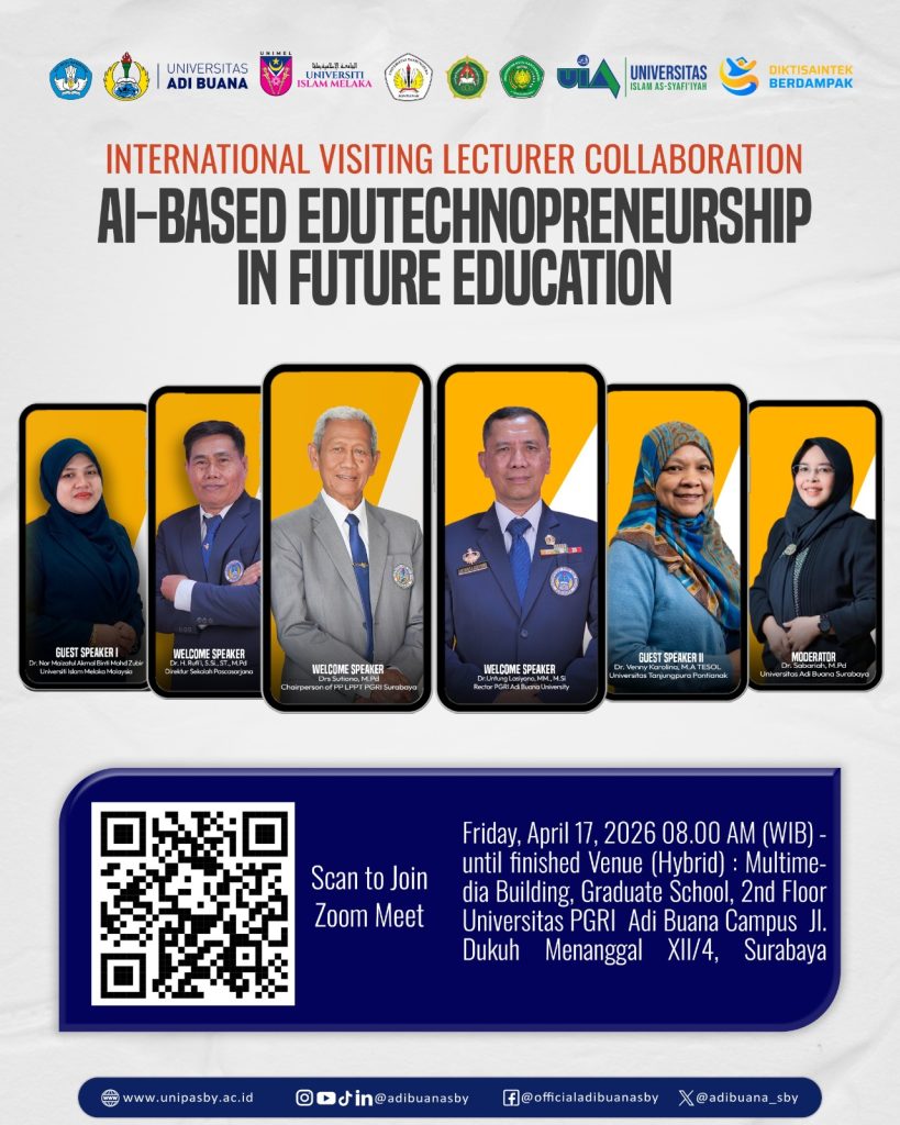 TP.FKIP.UNIVETBANTARA.AC.ID ~ Sukoharjo, 17 April 2026 — Mahasiswa Program Studi Teknologi Pendidikan Fakultas Keguruan dan Ilmu Pendidikan Universitas Veteran Bangun Nusantara turut berpartisipasi secara daring dalam kegiatan International Visiting Lecturer Collaboration yang mengangkat tema “AI-Based Edutechnopreneurship in Future Education”. Kegiatan ini diselenggarakan Universitas PGRI Adi Buana Surabaya Sekolah Pascasarjana secara hybrid pada Jumat, 17 April 2026, bertempat di Gedung Multimedia.