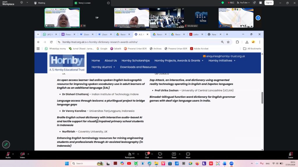 Pada sesi berikutnya, Dr. Venny Karolina, M.A TESOL dari Universitas Tanjungpura Pontianak membagikan pengalaman dan strategi dalam memperoleh hibah penelitian internasional, khususnya melalui program Hornby Trust. Ia menekankan bahwa keberhasilan proposal sangat bergantung pada kemampuan peneliti dalam mengidentifikasi kebutuhan nyata di lapangan. Salah satu contoh yang diangkat adalah pengembangan kamus Braille berbasis audio dengan dukungan teknologi AI untuk membantu siswa tunanetra, yang menunjukkan bagaimana inovasi teknologi dapat memberikan dampak sosial yang signifikan.